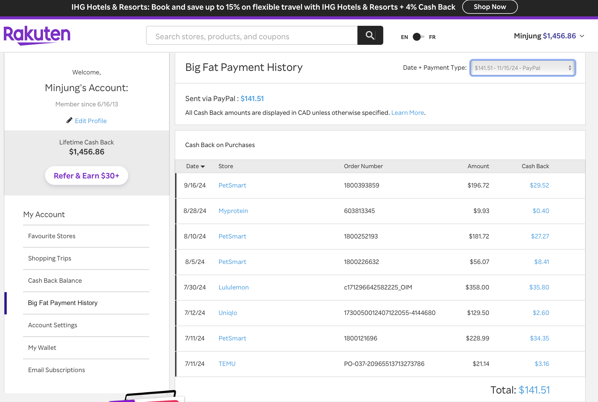 위 스크린샷 보시면 아시겠지만 제가 지금까지 받은 캐시백이 $1,456.86! 어마어마하죠!!! 오른쪽은 24년 9월 15일부터 11월 7일까지 구입한 내역입니다. 펫스마트에서 20% 할인할 때 울 고양이들 웻푸드랑 리터 구입했고 라쿠텐으로 15% 캐시백 받았지요. 완전 개꿀! 게다가 룰루레몬, 유니클로, 심지어 테무까지 캐시백 가능하니 아래 링크로 접속해 확인해 보세요!